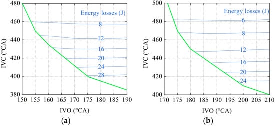Figure 14 shows the energy losses of Period I and Period II with a different IVO and IVC. In the area below the green line, the large amount of exhaust gas remaining in the intake manifold leads to an insufficient fresh air charge of the active cycle, so there are no data in this area for Figure 14 and the following figures. This will be explained in Section 4.3.