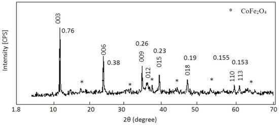 According to Equation (5), nanoparticles of cobalt ferrite can be synthesized during the building of LDH. Agreeing with XRD results, 13.2% nanoparticles of cobalt ferrite has been prepared and supported by the nanolayered structures of Co-Fe LDH.
