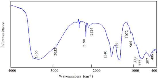 The symmetry and the nature of the functional groups of Co-Fe LDH were identified through the FT-IR technique as shown in Figure 3. The vibration of the hydroxyl groups of LDH was observed at 3400 cm−1 as a broad absorption band. The broadness of the OH band was due to existence of hydrogen bonds which was confirmed by observing weak band at 2952 cm−1 for the OH stretching mode of the hydrogen bonds to the interlayered anions [15,16]. The insertion of cyanate anions into the Co-Fe LDH structure was verified by the appearance of the ν1 vibration at 2190 cm−1 [29].