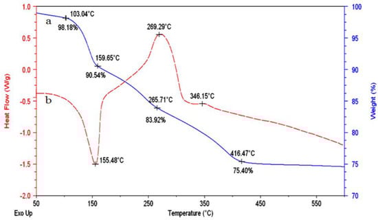 Thermal characteristics of the supported LDH were determined by TG and DSC as shown in Figure 4. The TG diagram of Co-Fe LDH revealed four weight losses as shown in Figure 4a. The first and the second weight losses up to 160 °C was 10% representing release of both the surface and the intercalated water of the LDH. The third weight loss was 7% and occurred from 161°C to 265 °C because of the oxidation of the cyanate anions. The fourth weight loss happened from 272 °C to 417 °C. It was 8% corresponding to the decomposition of carbonate anions and the dehydroxylation process. DSC diagram confirmed the TG results. One endothermic peak was observed at 155 °C indicating release of the water of the LDH structure as shown in Figure 4b. The second peak at 269 °C was exothermic agreeing with the exothermic and endothermic effects of the oxidation of cyanate anions and the decomposition of carbonate anions. There is a small exothermic peak observed for the fourth weight loss, suggesting the occurrence of a reaction between the products of the oxidation of cyanate anions and the decomposition products of carbonate anions during the dehydroxylation process of the layers.