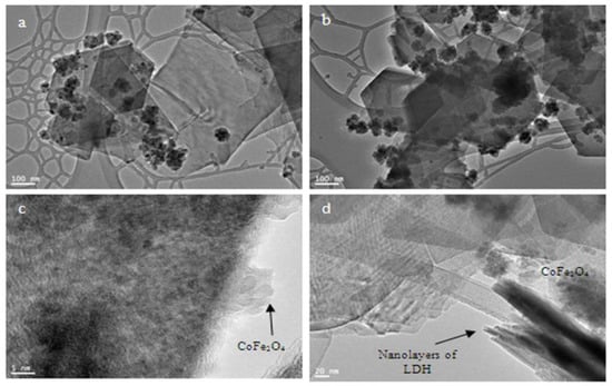 It is known that the crystals of the hydrotalcite-like compounds have hexagonal plate-like morphology if carefully crystallized [20]. A similar morphology was observed for the prepared Co-Fe LDH with ultra-thin plates as shown in Figure 5. The lateral view for the plates of LDH showed that the thickness of the plates was less than 20 nm as shown in Figure 5d. It means that the plates of the prepared Co-Fe LDH consist of less than 20 nanolayers. In addition, Figure 5a,b showed agglomerations of some nanoparticles. At a high magnification, Figure 5c,d showed that these particles have a nearly spherical shape and their size are in the range of 5 nm. Agreeing with XRD results, these nanoparticles are cobalt ferrite (CoFe2O4) and their agglomerations are due to their magnetic properties.