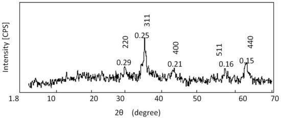 Figure 7 illustrates the XRD pattern of the product obtained by the decomposition of the supported LDH under critical conditions of pressure and temperature in presence of methanol and ethanol. The XRD pattern exhibited the characteristic diffractions peaks of cobalt ferrite (JCPDS 79-1744). The main diffraction peaks of the planes (220), (311), (400), (511), and (440) of cobalt ferrite were broad suggesting that their crystals are in the nano scale. In the same time, the characteristic peaks of the lamellar structure of LDH disappeared. It means that the layered structure of Co-Fe LDH was transformed to a clear phase of cobalt ferrite. The crystallite size of the produced cobalt ferrite was calculated from the XRD line broadening using the following Scherer relationship [30].