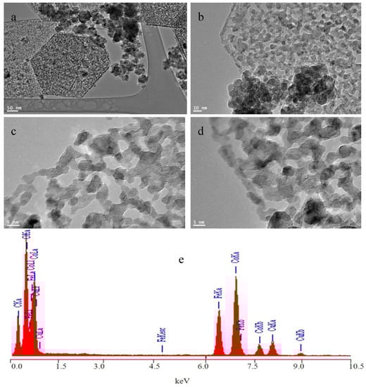 In addition, aggregations of the nanoparticles were observed in Figure 8a,b. These nanoparticles were also observed in the Co-Fe LDH before the thermal treatment and were due to CoFe2O4. These nanoparticles have spherical shape with size less than 10 nm as shown in Figure 8b. These nanoparticles did not change after the thermal treatment. This means that these nanoparticles act as catalysts during the decomposition reactions of LDH structures, where the catalyst does not change during the reaction. By using EDX technique, cobalt, iron, and oxygen were clearly identified in the nano-nets of cobalt ferrite as shown in Figure 8e. It is known that the signals of the copper and the carbon belong to the carbon-coated copper grid for the TEM testing.