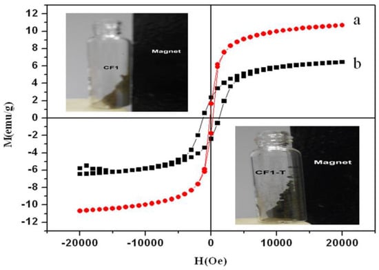 In the case of the cobalt ferrite nano-nets, it showed and S-type curve with a wide hysteresis loop, representing the behavior of ferromagnetism as shown in Figure 10b. The saturation magnetization (Ms) and remenant magnetization (Mr) of the nano-nets were 6.44 emu g−1 and 2.3 emu g−1; respectively. The coercitivity (Hc) of the nano-nets has been found at 1277 Oe. The prepared nanoparticles of cobalt ferrite revealed S-type curve with no hysteresis loop as shown in Figure 9. This is a typical behavior of superparamagnetism. By comparing with the prepared nanoparticles of cobalt ferrite, both the supported LDH and the nano-nets showed ferromagnetic behavior. However, the supported LDH and the nano-nets are composed of nanoparticles. It means that the morphology of the nanoparticles has an important role for controlling their magnetic properties. The low value of saturation magnetization of the nano-nets compared to the supported LDH and the nanoparticles could be explained in the light of morphology of the sample. Where, the nano-nets are composed of nanoparticles and nanowires in addition to vacancies and holes. The presence of vacancies and interatomic spacing caused low magnetization in the nano-nets of the ferrite [33,34].