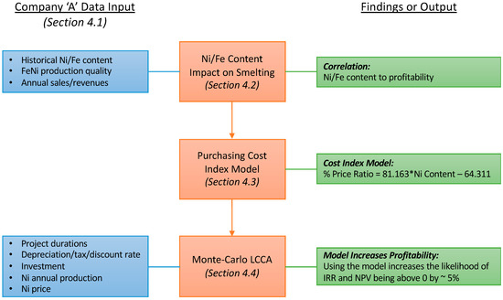 To explore the financial efficiency of the model, the authors performed a LCCA comparing the “as-is” constant price ratio versus the use of the ore purchase index model (Equation (6)). The economic analysis was performed for a best (high-grade ore), worse (mid-grade ore), and worst (low-grade ore) case of Ni and Fe content. These cases are shown in Table 3.