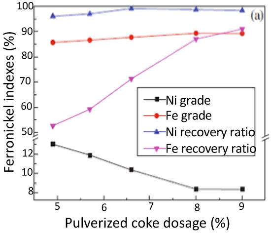 The authors collected historical smelting data from Company A operations including the typical ore Ni and Fe content, FeNi production quality, and the annual sales and revenues based on said ore qualities. Figure 3 shows the recovery rates for Ni and Fe as well as the changes in the metal content of Ni depending on the amount of reducing agent [6,7]. Figure 4 depicts the Ni/Fe ratio regression model based on Company A historical ores.