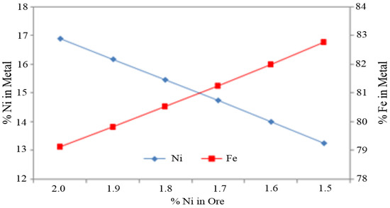 - The Fe content increases from 15% to 25%, as shown in Table 2. To achieve these values, the Ni% is calculated from the Fe% by using the relationship shown in Figure 4. Then, a price ratio is calculated from the Ni% value using Equation (6).
