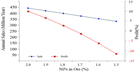 In executing Equation (5), the authors found the production rate of the slag to be 76.9% and the metal 11.6%. Figure 7 depicts Company A’s sales and profit data associated with the metal production ranges calculated above. For these calculations, the following variables values were used per above calculations and Company A’s production data: 96% Ni recovery, 60% Fe recovery, 4% non-Ni/Fe, and an annual Ni production of 26,000 tons/year. As shown in Figure 7, 1.75% Ni content is the approximate break-even point.
