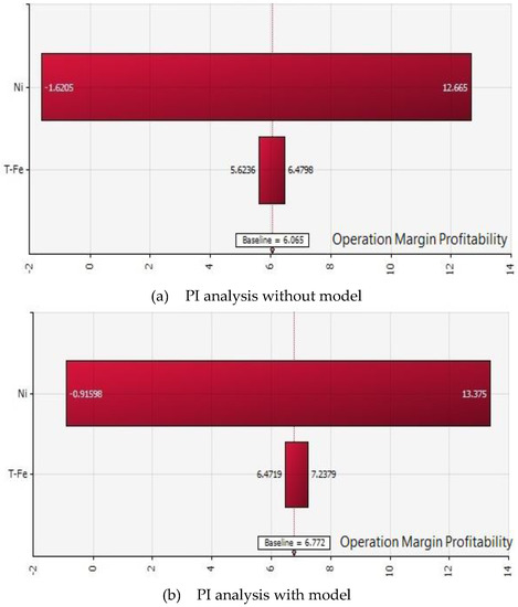 By applying an ore purchase price patio that varies according to the Ni or Fe content, the manufacturer’s risk is mitigated. The above is an illustrative example of this. To validate this model’s risk sharing potential (in comparison to the existing model), a LCCA was performed. The LCCA was performed using the @Risk Monte Carlo software, with the calculations and assumptions outlined in Equations (10)–(14). The outputs are the smelter’s NPV, IRR, and PI when the model is and is not used. As can be seen in Figure 8, using the model equates to an NPV average increase of 16 M USD. However, it should be noted that the results of using the model depict lower minimum and maximum profits.