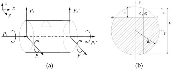 Figure 3 is a schematic of the transverse crack. Figure 3a is the free body diagram, and , , , , , are the external loads that the shaft suffering. Figure 3b is the section view of the crack, where, a is the crack depth, the width of the crack is 2b, Rc is the radius of cross-section. The crack mode is determined by the external loads , , , , , and only the individual mode is considered for simplicity in the paper. Similar analysis can be performed for the mixed mode.