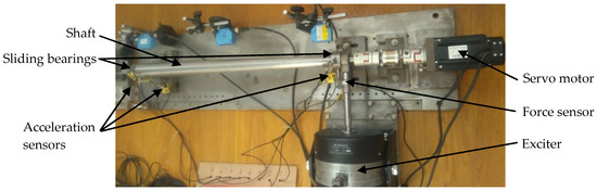 As shown in Figure 4, the shaft to be tested is supported by two sliding bearings which are fixed on a steel base, and the shaft is driven by a servo motor (2.5 Kw, 3000 RPM). The acceleration sensors (PCB LW16 series) are fixed on the bearings and the steel base. An exciter is used to stimulate the elastic waves in the shaft by acting a pulse force to the shaft. The pulse force is measured by a force sensor too.