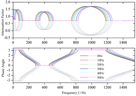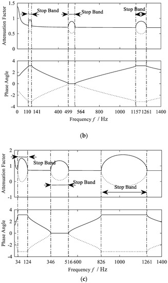 where, T is the transfer matrix. Suppose the i-th eigenvalues of the matrix T to be , and the eigenvalue is usually a complex number and can be expressed as , where is known as the propagation constants, , is known as the attenuation factor, indicating the attenuation of the amplitude of the elastic waves varying with the frequency of the wave component, is the phase angle indicating the phase difference of the wave components during the propagation. When the phase angle equals 0 or , it means that the transmitted waves encounter the reflected ones cancelling out each other and the waves with corresponding frequencies could not pass through the shaft [17].