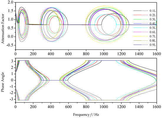 In this subsection, the influence of the location of the transverse crack to the propagation characteristics of the elastic waves is studied. Mode III is chosen for the aforementioned reason. The non-uniform shaft is still the same one but with different crack locations as listed in Table 1. Similarly, substituting all the parameters into Equation (3), the transfer matrix can then be derived. The propagation characteristics of the elastic waves are obtained in a numerical manner, and the results are shown in Figure 8.