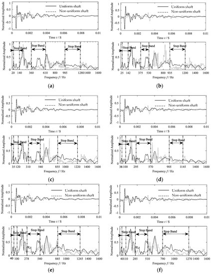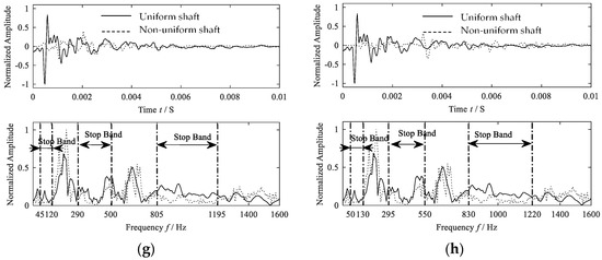 Experiments are performed in the rig according to the conditions listed in Table 2. The shaft is driven by a servo motor and rotate at 3000 rpm. The stimulator gives the shaft an instant force to stimulate the elastic waves, and then the wave begins to propagate from the stimulated end to the other, just as propagating from location x0 to location xl in Figure 1b. Acceleration sensors are set on both ends of the shaft, which can capture the waves. As mentioned before, the uniform shaft having the same mass with the non-uniform shaft is also studied here for deducing the propagation constants by comparison. The propagation characteristics of the elastic waves in the real shafts can be deduced by comparing the spectrum of the signals of the uniform shaft and the non-uniform shaft [17]. The result is shown in Figure 7.
