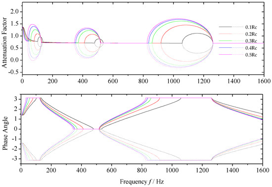 It is researched in this subsection that how the depth of transverse crack affects the propagation characteristics of the elastic waves. Mode III is adopted here for the conclusion of Section 3.1. The non-uniform shaft is still the same one but with different crack depths as listed in Table 1. Similarly, substituting all the parameters into Equation (3), the transfer matrix is then derived. In addition, the numerical method is adopted to obtain the numerical results of the propagation characteristics of the elastic waves, the numerical results are shown in Figure 10.