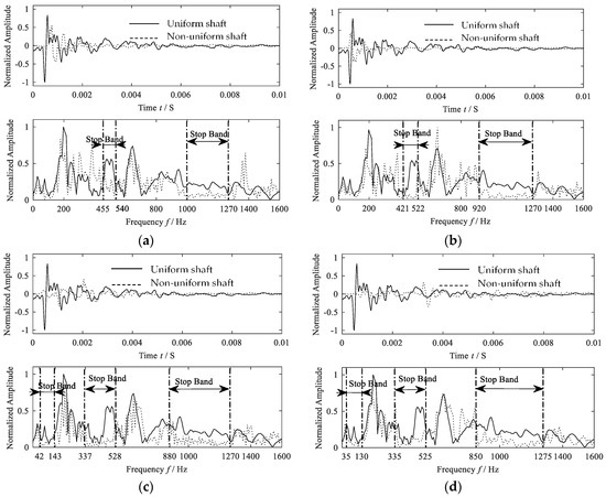 The time histories of the acceleration signals are truncated to 0.01 s for all cases, and these signals were captured after propagating through the shaft. The real lines stand for the uniform shaft while the dotted ones stand for the non-uniform shaft. All the stopbands shown in Figure 9 are listed in Table 4 for comparison. The case of location 0.3L has already been studied in Section 3.1 and the result of which is listed in the table too.
