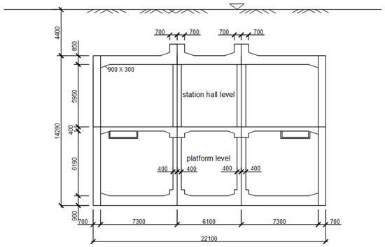The present study refers to another interesting structure: a segment of a subway station. It represents a statically indeterminate RC structure, consisting of a top slab, a bottom slab, two lateral walls and two columns connecting the top and bottom slabs. A 1:4-scale model of this structure was tested by Lu et al. [40]. Before the fire test, the structure was subjected to mechanical loads, simulating a combination of in situ ground pressure, water pressure, as well as dead and live loads that occur in the tunnel under service conditions. These loads were kept constant throughout the subsequent fire test. During this test, the temperature of the air in the interior of the tested structure was increased according to a prespecified temperature history. The performance of the structure was monitored during the test by means of temperature sensors (“thermocouples”) and strain gauges.