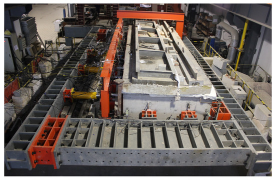 Inspired by the structure illustrated in Figure 1, a model of the upper floor was tested at a scale of 1:4; see Figure 2 and [40]. The width of the tested structure was ; its height was ; and its axial length was ; see Figure 3.
