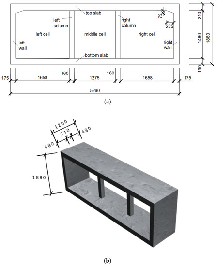 Geometric dimensions of the tested structure (mm): (a) cross-section and (b) perspective representation; adapted from [40].