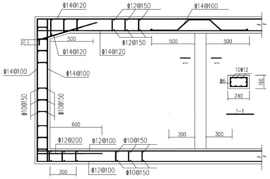 The reinforcement ratio of the top slab, the bottom slab, the columns and the walls amounted, by analogy to the real structure, to 1.22%, 1.19%, 2.95% and 1.76%, respectively. The reinforcement bars had diameters of 10 mm, 12 mm and 14 mm, respectively; see Figure 4.