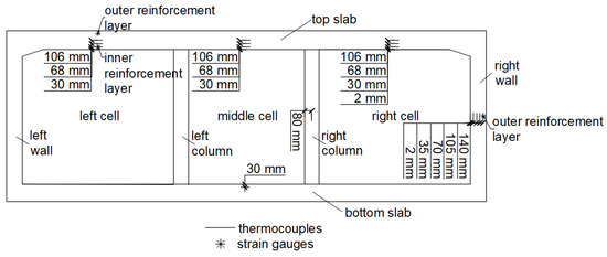 Temperature and strain sensors were put in place already before casting of the concrete. In this way, the sensors were finally embedded inside the tested structure. As to be expected in fire testing [45], some of the sensors failed during the experiment. Therefore, the following description is limited to measurement equipment, the readings of which are considered in the present work. Thermocouples were placed at six positions within the tested structure (Figure 5): three in the top slab (one at the midspan of each one of the three cells), one in the right column, one in the right wall and one in the middle cell of the bottom slab. At the selected positions, several sensors were placed at different distances from the heated inner surface, in order to monitor the ingress of heat into the structure; see Figure 5. The minimum cover depth of the thermocouples amounted to 2 mm.