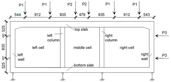 Strain gauges were mounted to steel bars of the inner and the outer reinforcement layer. Measurement positions were located at the top slab, at the midspan of the left cell and at the center of the right wall; see Figure 5.