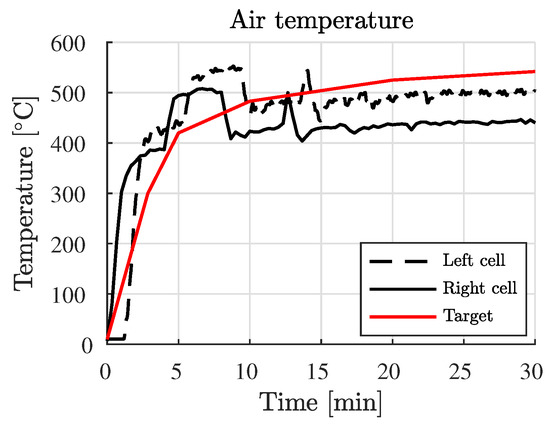 During the fire test, the temperature of the air inside the cross-section was increased according to a time-dependent temperature history (Figure 7). The latter was the result of a statistical analysis of documented fire accidents. Within 25 min, the temperature was increased to a target value of approximately 525 C. It was kept constant thereafter. The prescribed fire load accounted for the ventilation of the real structure, with a speed of , automatic sprinkler devices and a heat release rate of [40], in accordance with the Chinese Standard for Metro Design [47]. Two controlled heat sources of the furnace were used to produce the thermal loading. The heat was transferred to the tested structure by means of natural (unforced) convection.