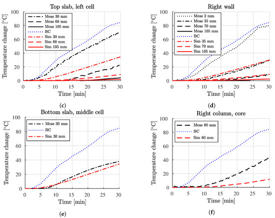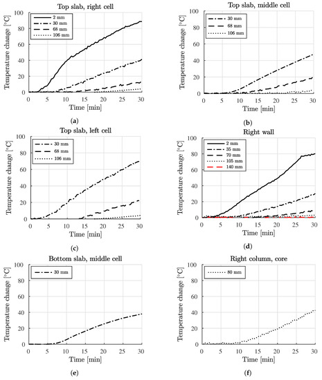 The temperature close to the inner surface of the top slab, at the midspan of the right cell, rose by approximately 90 during the first 30 min of the fire test; see Figure 8a. The temperature decreased with increasing distance from the heated inner surface (see the four graphs in Figure 8a), which shows the measured evolutions of temperature changes at distances of , , and from the heated inner surface. At a depth equal to or greater than , the temperature remained practically constant throughout the analyzed part of the fire test. A qualitatively similar, but quantitatively different behavior was measured at the other measurement positions of the top slab, the right wall and the bottom slab; see Figure 8d,e. At the center of the right wall, e.g., the temperature close to the inner surface rose by about 80 , while no temperature increase was measured at depths equal to or greater than . The temperature of the right column was measured at its core, at a distance of to the nearest heated surface. Notably, the core temperature of the column rose significantly more than that at the same depth in the slabs and the right wall. The measured temperature evolution is, in fact, comparable with that at a depth of some in the top slab.