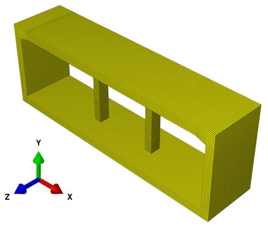 The load-carrying behavior of the tested structure was analyzed by means of three-dimensional Finite Element simulations, using Abaqus FEA 2016. The chosen Finite Element mesh was similar to the one used for the thermal simulations; see Figure 10. The concrete structure was modeled by 139,040 hexahedral elements of type “C3D8R”, i.e., eight-node linear elements with reduced integration and hourglass control, with three translational degrees of freedom per node. The steel rebar was considered by 18,035 line elements of type “T3D2”, i.e., two-node linear three-dimensional truss elements, with an axial displacement degree of freedom per node. Perfect bond between concrete and steel rebar was assumed by attaching the nodes of the steel elements to the nodes of the concrete elements.