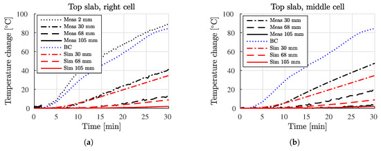The simulated and measured temperatures also agree well at the middle cell of the bottom slab. Here, the maximum difference between the simulated and the measured temperatures is 2.5 . This suggests that the two surfaces at the midspan positions of the right cell of the top slab and of the middle cell of the bottom slab were exposed to very similar temperature histories; see Figure 14a,e.