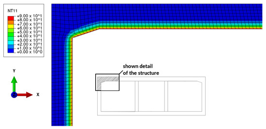 Temperature distribution obtained by prescribing a uniform surface temperature history, 30 min after the start of the thermal loading: detail showing the connection of the left wall to the top slab.