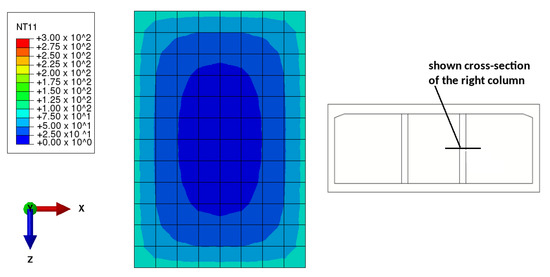 Temperature distribution obtained by prescribing a uniform surface temperature history, 30 min after the start of the thermal loading: detail showing the central cross-section of the right column.