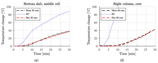 At the entire inner surface of the simulated structure, the same temperature history was prescribed; see the blue dotted graphs, labeled “BC”, in Figure 11. The prescribed evolution of the surface temperature was obtained by averaging the readings of the two thermocouples that were positioned at a distance of from the heated inner surface; see the dotted black lines in Figure 11a,d. The other graphs shown in Figure 11a refer to the simulated (label “Sim”) or measured (label “Meas”) evolutions of temperature changes at positions , and away from the heated inner surface; see also Figure 5.
