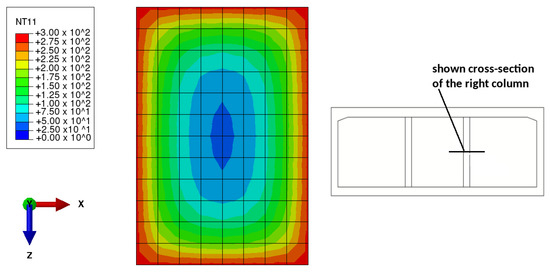 Temperature distribution obtained by prescribing three piecewise uniform surface temperature histories, 30 min after the start of the thermal loading: detail showing the central cross-section of the right column.