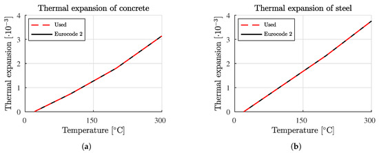The thermal properties of the concrete of the tested structure were unknown. As a remedy, the values of the specific heat capacity and the thermal conductivity were estimated in accordance with building codes [43,44,51,52] and scientific studies [53,54,55]; see Table 4. These values refer to room temperature. Notably, the experimental measurements suggest that the temperature of the structure remained below 100 during the first 30 min of the fire test (see Figure 8) and, thus, that the evaporable water of the concrete was not released [53,56]. This served as a motivation to assume, in the spirit of a reductionist approach, that the thermal properties of concrete at room temperature are a reasonable approximation throughout the entire analysis, although the thermal conductivity of concrete decreases to some 90% of its room-temperature value, provided that the material is heated up to 100 ; see the building codes [43,44,52] and the scientific studies [1,53,55,57,58].