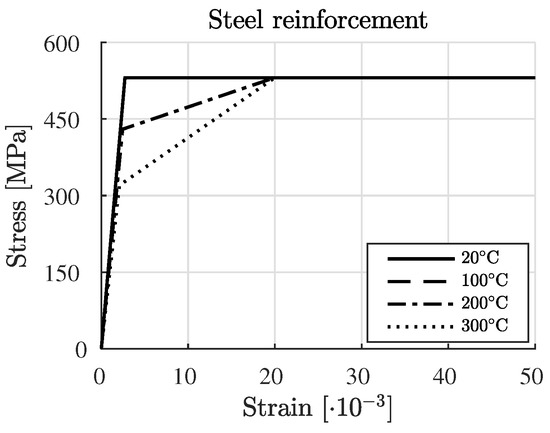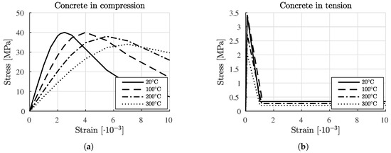 The material behavior of concrete is simulated as either temperature-independent and linear-elastic or temperature-dependent and elasto-plastic. For the latter simulation, the Concrete Damaged Plasticity (CDP) model of Abaqus FEA is used [42]. Thereby, the nonlinear constitutive behavior of concrete and steel, including their temperature-induced degradation, agree with the recommendations by the Eurocode 2 [43] and the fib Model Code [44].
