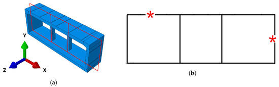 The supports of the structure were accounted for by means of prescribing displacement boundary conditions. Four sets of such boundary conditions were prescribed in order to prevent displacements of the bottom ends of the walls and of the columns, in the direction of the axes of the columns; see Figure 6. Two additional sets of displacement boundary conditions were prescribed in order to prevent horizontal displacements of the left wall, in the direction orthogonal to the axes of the columns; see Figure 6.