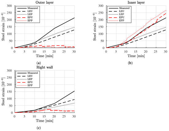 Good agreement between simulated and measured temperatures would likely be achieved by amplifying, separately for the middle and the left cell, the history of the surface temperature that was so far prescribed. The corresponding subdivision of the heated surface of the simulated structure into five sub-regions, with a specific temperature history for each of them, could be the target of another refinement step. Still, temperature measurements remain unavailable for the right and the left cell of the bottom slab, the left wall and the left column. Thus, the re-analysis of the fire test inevitably requires assumptions concerning the specific histories of the surface temperature in these regions. Alternatively, one could fit them such that the subsequent thermomechanical simulations deliver strains that agree well with the available strain measurements. This would result in the best-possible reproduction of the available experimental data. However, the involved fitting process would render the assessment of the sensitivity of simulation results with respect to the simulated material behavior of concrete very difficult. Since this sensitivity is a central focus of the present contribution, it was decided to stay with the two described strategies of prescribing thermal boundary conditions along the heated inner surface of the analyzed structure and to combine them with two strategies of accounting for the material behavior of concrete. A discussion of the simulation results in the regions of the structure that were not equipped with thermocouples is given in Appendix A.