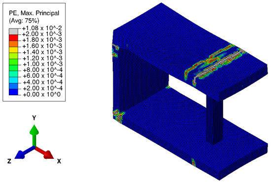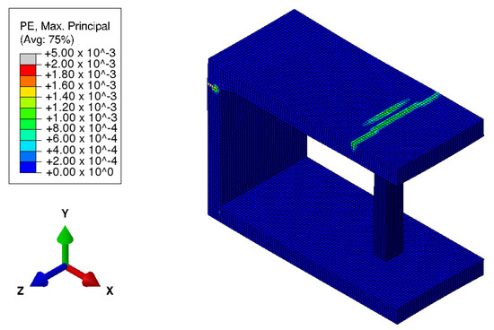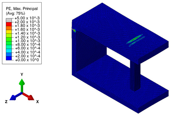 The external mechanical loads, imposed on the structure, were accounted for by means of prescribing traction boundary conditions. The six concentrated forces, acting on the top slab, and two loads, acting on the right wall (Figure 6), were prescribed by means of equivalent pressures amounting to .