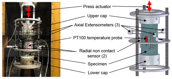 Cyclic tension–compression tests were first performed to determine the complex modulus and complex Poisson’s ratio of the five considered cylindrical specimens. A hydraulic press was used in strain-controlled mode to apply cyclic sinusoidal axial loadings with an amplitude of around 50 μm/m. The axial stress σz was measured with a load cell, the axial strain εz was obtained from the average of three extensometers placed at 120° from each other, and the radial strain εr was derived from the measurements of two non-contact sensors. The procedure developed at ENTPE/University of Lyon laboratory is detailed in other publications [24,25,26]. The complex notation of the axial stress, the axial strain and the radial strain are given in Equation (1):