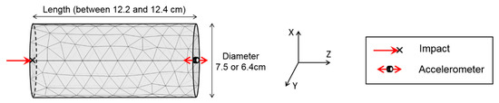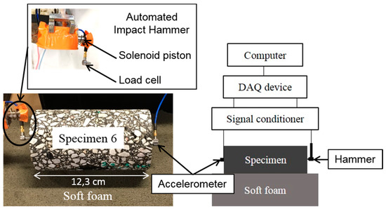 First, the specimens used for complex modulus tension–compression test were sawed to separate the glued upper and lower metallic caps before performing the dynamic measurements. An impact hammer equipped with a load cell (PCB model 086E80) was used as an external source of excitation. The order of magnitude of the maximum strain induced in the specimen by the impact is of about 0.1 μm/m [18,21]. The impact hammer was automated with a solenoid piston programmed with a microcontroller (Arduino Uno R3) to improve the repeatability of the test and to allow measurements directly inside a thermal chamber. This automated system was inspired by systems previously developed by Norman et al. in 2012 and Brüggemann et al. in 2015 [35,36]. The response of the materials was recorded with an accelerometer (PCB model 353B15). The impact hammer and the accelerometer were connected to a signal conditioner (PCB model 482C15) and the signal conditioner was connected to a data acquisition device (NI USB-6356) connected to a computer. To achieve free boundary conditions, soft foam was placed under the specimens during the tests. In this study, only the longitudinal compression mode of vibrations was considered. For this mode of vibrations, the impact is applied in the centre of one short side of the cylinder while the acceleration is measured in the centre of the opposite short side. The experimental set up for the dynamic tests corresponding to the longitudinal mode of vibrations is presented in Figure 2.