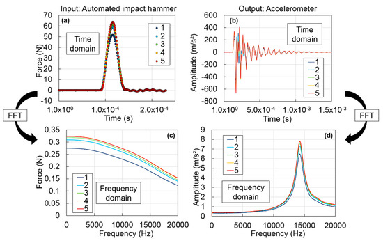 As shown in Figure 3, the frequency spectrum of the impact contains energy up to 20 kHz, which is the maximum frequency considered for the calculations of frequency response functions (FRFs) in this study. FRFs were calculated from the frequency domain signals as follow: