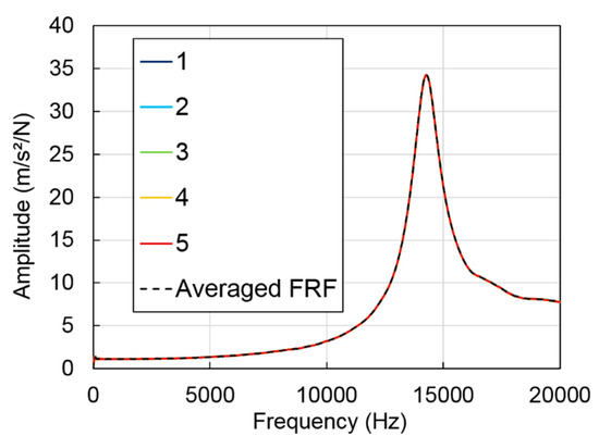 where H is the FRF, Y is the FFT of the measured acceleration, X is the FFT of the applied force, X* is the complex conjugate of the applied force and the bar above corresponds to the arithmetic average from the five impacts. The five FRFs corresponding to each of the five impacts and the averaged FRF (Equation (8)) for specimen GB5-3 at 14.7 °C are displayed on Figure 4. Figure 4 shows that the six FRFs overlaps, which confirms the very good repeatability of the test.