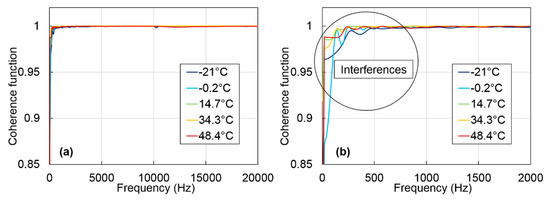 where CF is the coherence function, Y and Y* are the FFT of the measured acceleration and its complex conjugate, X and X* are the FFT of the applied force and its complex conjugate and the bar above corresponds to the arithmetic average. The coherence functions of specimen GB5-3 for the five tested temperatures are presented in Figure 5. For all temperatures, the coherence function is very good with values close to one for frequencies higher than 1000 Hz. It is therefore recommended to not use the frequencies below 1000 Hz.