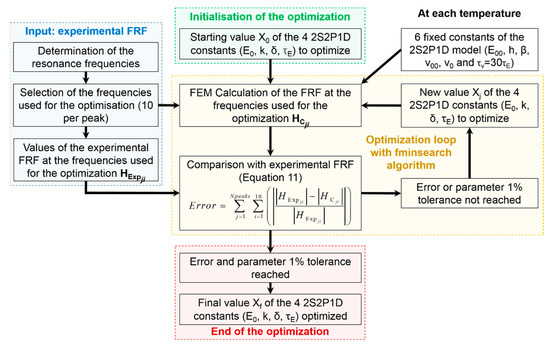 The optimization was performed in MATLAB with the “fminsearch” algorithm and the optimization was stopped when the error and the parameter tolerance of 1% is reached (e.g., when the variation of the error and of all the values of the four constants to be identified is less than 1% between two iterations of the algorithm). The final vector Xf of the four constants (E0, k, δ and τE) was then used with the three fixed constants related to the complex modulus (E00, h, and β) to back-calculate the complex modulus at the resonance frequencies of the peaks used as input for the optimization at the considered temperature. The optimization procedure to identify the four 2S2P1D model constants (E0, k, δ and τE) at each temperature is explained in Figure 7.