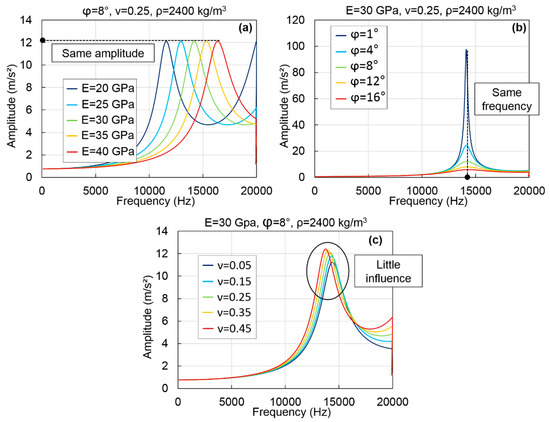 Influence of: E (a); ϕ (b); and ν (c) on the first peak of the FRFs corresponding to the first resonance (example of calculations for a cylinder with a 7.5 cm diameter and a 12.3 cm length).