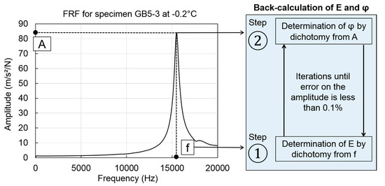 To confirm the observation raised in Figure 8, the relative standard deviations (RSD) for the first resonance frequency and amplitude were calculated for the three studied constants. Results are given in Table 3. They confirm the previous observations and also indicate that the norm of the complex modulus has really no impact on the peak amplitude while the phase has a very little influence on the frequency. The Influence of the Poisson’s ratio can be considered as negligible when compared with the influence of the two other constants. Observations presented in Figure 8 and Table 3 justify the assumption of a constant real value of 0.3 for the Poisson’s ratio. In addition, the identification of the norm and phase of the complex modulus can be separated into two steps: the norm can be determined by dichotomy from the first resonance frequency and then the phase can be determined by dichotomy from the corresponding amplitude. This process was repeated iteratively until the error on the amplitude is less than 0.1%. Figure 9 shows the principle of the back-calculation of the complex modulus using the first resonance peak of the FRFs.