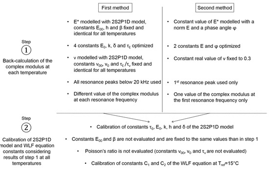 Differences between the two proposed methods concern the first step in which the complex modulus is back-calculated at each temperature, while the second step is identical for the two methods. First, the assumptions on the Poisson’s ratio value are different in the two methods. In the first method, the Poisson’s ratio is a complex number, which depends on the frequency and on the temperature, and is modelled with the 2S2P1D model assuming the values of constants ν00, ν0 and τE/τν. In the second method, a constant real value of Poisson’s ratio equal to 0.3 is assumed. Another difference is that all resonance peaks under 20 kHz are considered in the first method while only the first resonance peak is used in the second method. Consequently, the second method gives only one value of the complex modulus at each temperature while the first method gives values for each resonance frequency. This difference is not essential in this study since 50 °C is the only temperature for which two peaks were observed. However, it can be interesting to evaluate more than one value of the complex modulus at each temperature. Finally, in the first method, four constants are evaluated at each temperature using a complex algorithm. In the second method, only two constants are evaluated using a simple dichotomy process. The second method is therefore very easy to apply and time-effective compared to the first method. Figure 10 highlights the main differences between the first step of the two methods and gives the principle of the second step that is identical for the two methods. Note that, even though the same constant h is fixed for the back-calculation at each temperature (in the first step of first method), a different constant h value can be obtained during the calibration process of the second step.