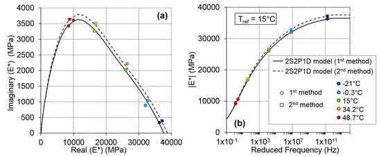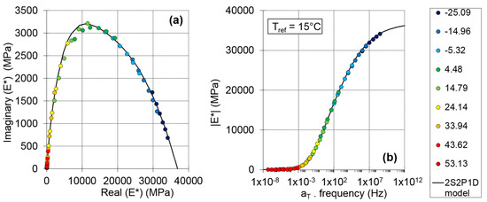 Results of the tension–compression tests for specimen WF-8 are plotted in Figure 11. A continuous curve can be seen on the Cole–Cole diagram, which indicates that the material is rheologically simple and that the time–temperature superposition principle (TTSP) is valid. The master curve of the norm of the complex modulus is plotted at a reference temperature (Tref) of 15 °C in Figure 11. The 2S2P1D model was fitted to the experimental data and is also plotted in Figure 11. A very good agreement between the experimental data and the 2S2P1D model can be observed.