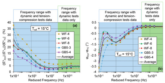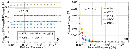 Difference between the complex modulus obtained from the two methods of analysis of the dynamic tests plotted at a reference temperature of 15 °C for all specimens: (a) relative difference for the norm of the complex modulus (in %); and (b) difference for the phase of the complex modulus (in °).